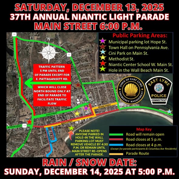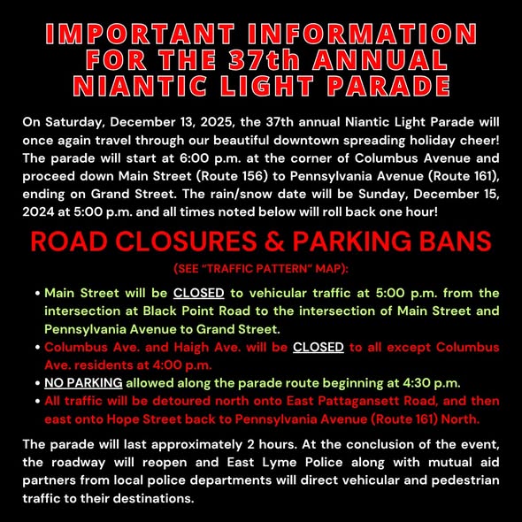 Join us Saturday, December 13, 2025 at 6:00PM on Niantic’s Main Street for one of the most magical nights of the year! The parade kicks off at the corner of Columbus Ave & Main Street (Route 156) and will make its way to Pennsylvania Ave (Route 161) before ending on Grand Street. Rain/Snow Date: Sunday, December 14th at 5:00PM